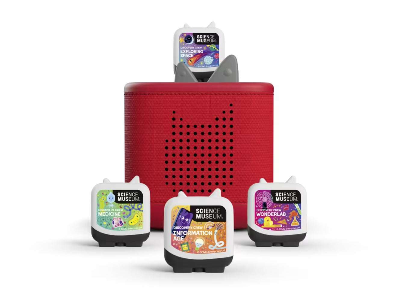 Curious kids just pop one of the four Tonies in this set on their Toniebox to head